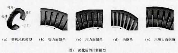 按照试验样机的高压鼓风机相关尺寸用三维制图软件ProE将上述各叶片倒角形式的风机模型建立,