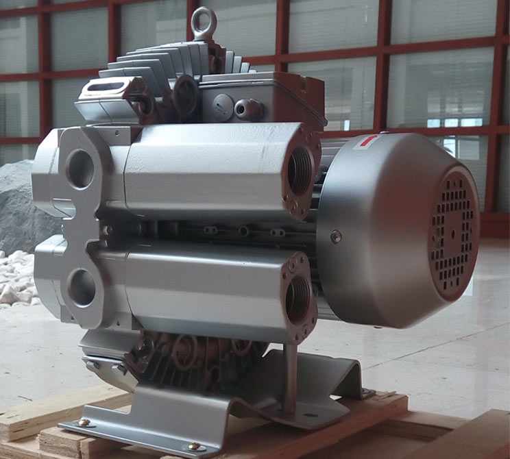 叶轮片之间的空气呈螺旋状加速旋转并将泵体之外的气体挤入侧槽,当它进入侧通道以后,气体被压缩,然后又回复到叶轮片间再次加速旋转。当空气沿着条螺旋形轨道穿过叶轮和侧槽时, 每个叶轮片增加了压缩和加速的程度,随着旋转的进行,气体的动能增加,使得沿侧通道通过的气体压力进一步增加。 当空气到达侧槽与排放法兰的连接点处的侧通道在出口处变窄,气体即被挤出叶轮片并通过出口处的消声器排出高压风机泵体。