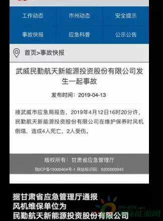 据武威市应急局消息,2019年4月12日当天16时20分许,甘肃民勤周家井航天新能源风电场在进行风机定检工作,本次检修队伍人员由天津万德莱斯科技有限公司(4人)、江苏航天万源风电设备制造有限公司员工(1人)和甘肃航天万源风电设备制造有限公司员工(1人)组成,共计6人。风机主设备供应商(上述股权链中的一环)组织开展检修工作。在进行风机定检工作时,一台风机塔筒倒塌,风机上6名检修工作人员跌落,致4人死亡,1人重伤,1人轻伤。事故发生后,当地已成立调查组,全面调查事故原因,并对善后事宜进行处理。