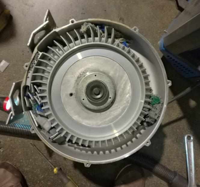图为损坏之后的叶轮,因进风口吸进去杂物,导致四周的叶片被坚硬物打碎。所以一要定做好进风口的防护工作。