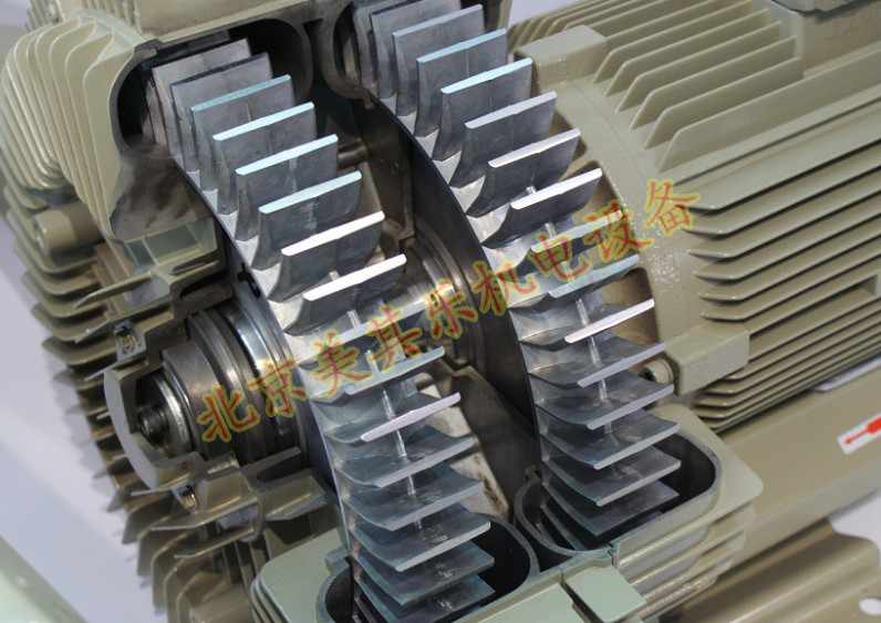 上图为双叶轮高压鼓风机内部叶轮的安装与固定样式,一个叶轮为一个腔体,串联增压,这也是双叶轮风机压力高的原因。