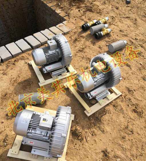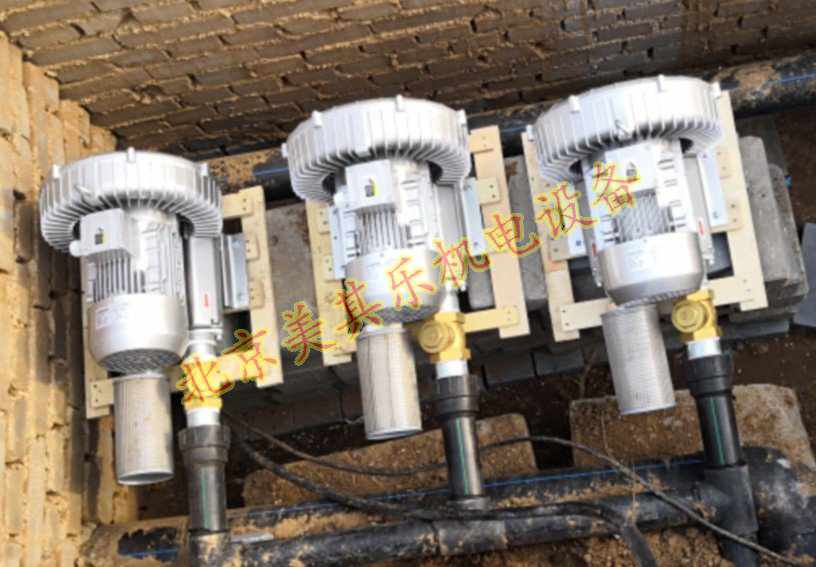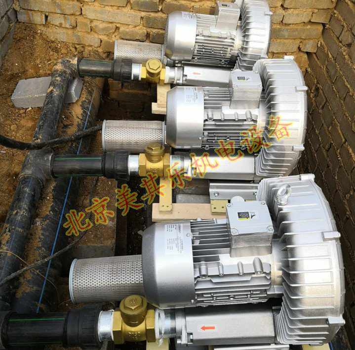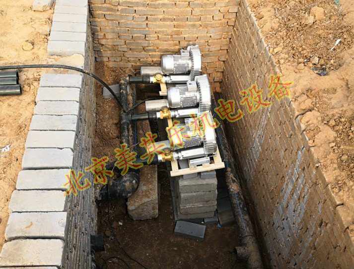 污水处理高压鼓风机应用安装现场照片,此为延庆客户某湿地公园配备的1.6kw鼓风机,用于污水的输送氧气曝气,采用两用一备模式工作,因污水池整体面积不大,而且深度也不是太深。